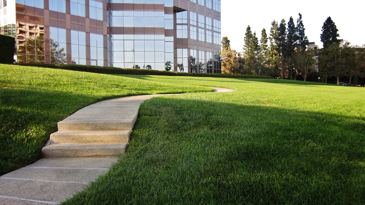 Neat, shaped, professional hedge lines around buildings and entryways.